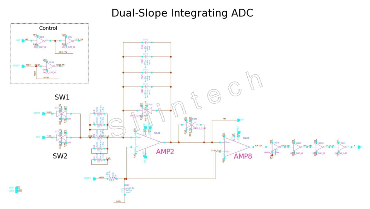 The algorithm of Dual-Slope Integration is adopted for the speed input ADC. AMP2 is for integrating the input signal, and AMP8 works as a comparator. At beginning, a reference voltage is used to charge the capacitor for a fixed time, and then the input speed voltage is used to discharge the capacitor until backing to initial level, so the ratio of discharge time and charge time will reflect the input speed voltage. A high-resolution digital counter would play the role for time counting, and output the converted digital value directly. The AMP8 should be designed with very high gain so as to minimize the error.The algorithm of Dual-Slope Integration is adopted for the speed input ADC. AMP2 is for integrating the input signal, and AMP8 works as a comparator. At beginning, a reference voltage is used to charge the capacitor for a fixed time, and then the input speed voltage is used to discharge the capacitor until backing to initial level, so the ratio of discharge time and charge time will reflect the input speed voltage. A high-resolution digital counter would play the role for time counting, and output the converted digital value directly. The AMP8 should be designed with very high gain so as to minimize the error.