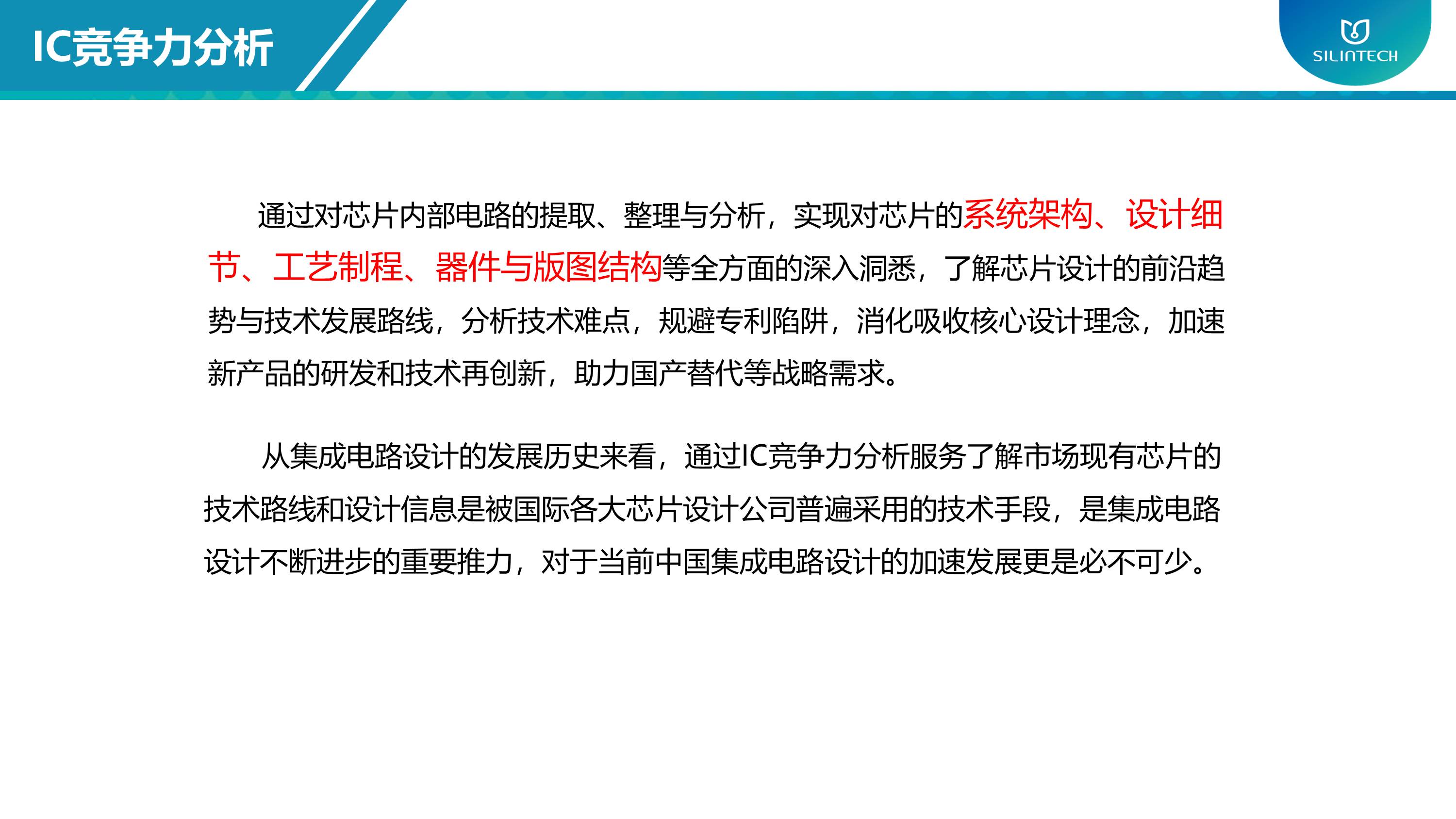 IC Competitive Analysis Introduction: Through extraction, sorting and analysis of the internal circuit chip,IC Competitive Analysis Introduction: Through extraction, sorting and analysis of the internal circuit chip,Implement chips on the system architecture, design details, technological process, device and in-depth insight into all aspects, such as landscape structure, development trends in the forefront of chip design and technology route, analysis of technical difficulties, avoid patent trap, and absorb core design concepts, accelerate the research and development of new products and technological innovation, and facilitate domestic substitution and other strategic needs.